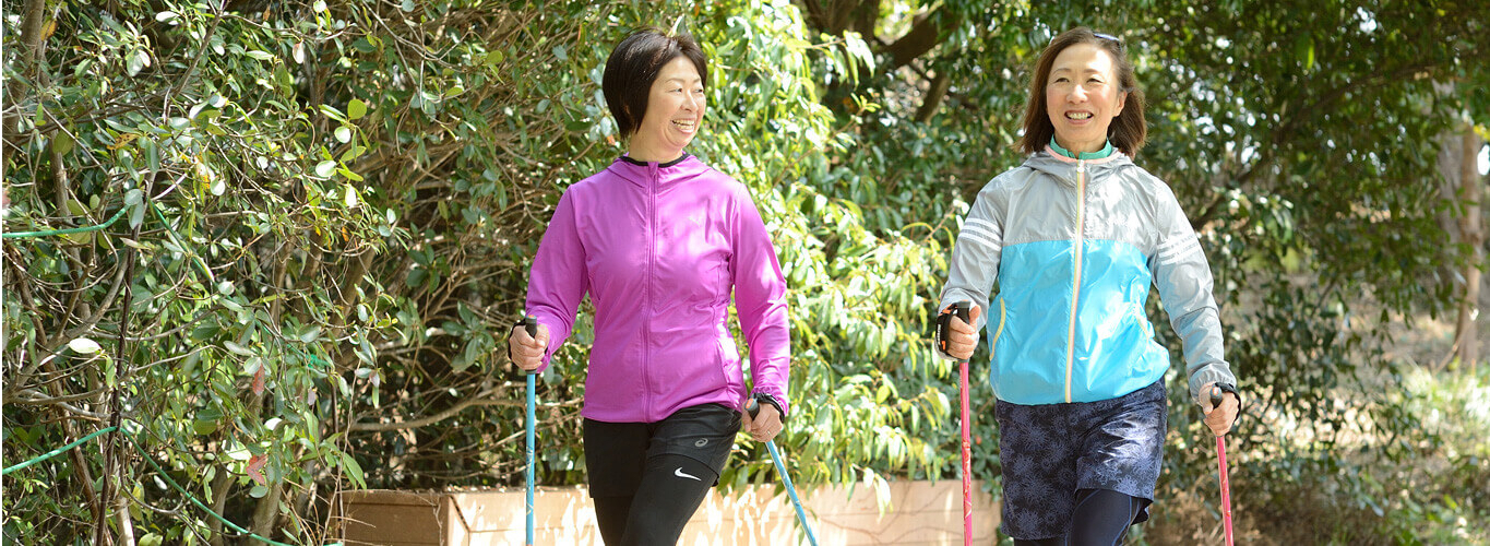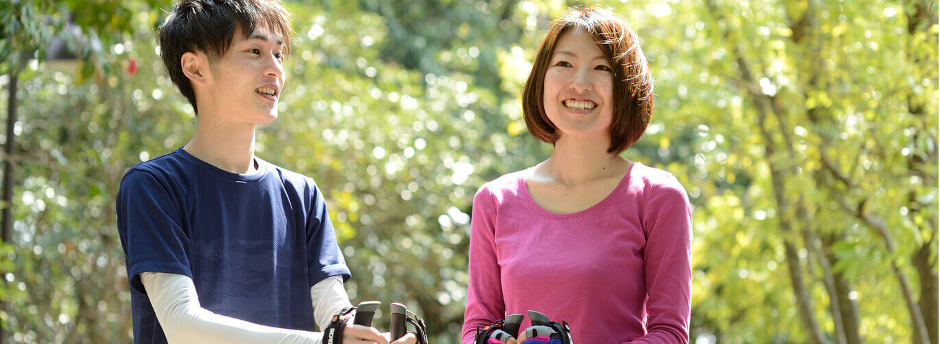 二本のポールを持って、クロスカントリースキーのように行うウォーキングで、北欧フィンランドが発祥の地です。ポールをつくことで、上半身を積極的に活用するだけでなく、運動による体への負担が軽減されるため、手軽さと高い運動効果が注目されています。誰もが楽しめるウォーキングとして、世代を超えて多くの人が楽しんでいます。